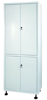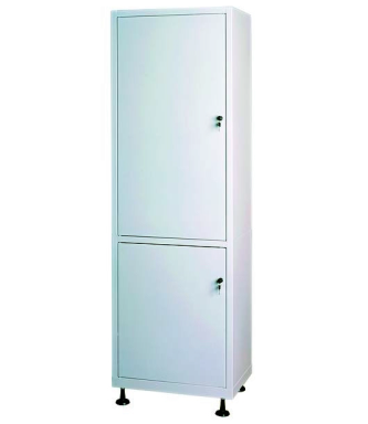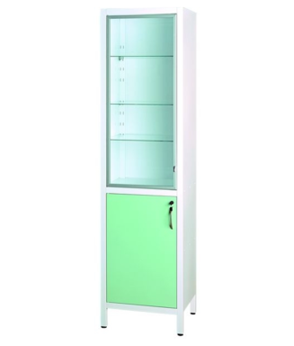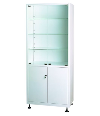 - Для хранения медикаментов. Обычно оснащены непрозрачными ударопрочными стеклянными или металлическими дверцами. Конструкция позволяет систематизировать медикаменты по различным признакам и группам, упрощая визуальный обзор. Некоторые из секций, предназначенных для хранения опасных или наркотических лекарственных препаратов, запираются на замок.