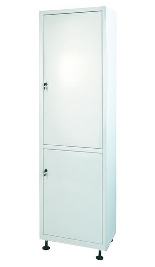 Эта модель состоит из двух расположенных одна над другой секций. Верхняя вмещает две полки, нижняя – одну. Оба отсека снабжены прочными, запирающимися на замок дверцами из стали. Это позволяет защитить наркотические, психотропные препараты, прекурсоры, ценное оборудование, документацию конфиденциального типа от несанкционированного доступа.
