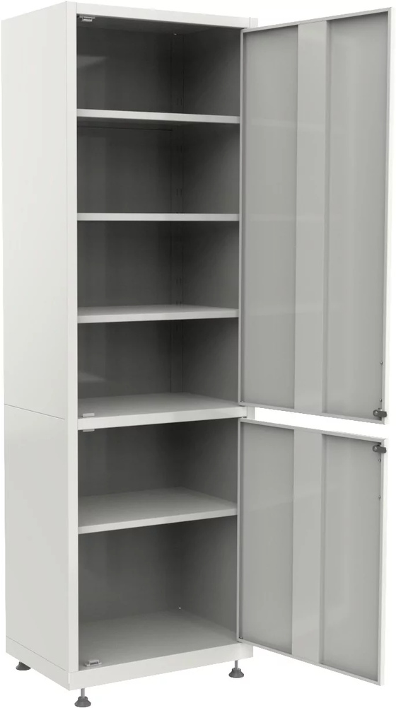 Модель имеет в наличии две расположенные вертикально секции. Верхняя оборудована 3 полками, нижняя 1. Обе дверцы изготовлены из высокопрочной стали, оснащены замками для ограничения доступа посторонних к содержимому шкафа.