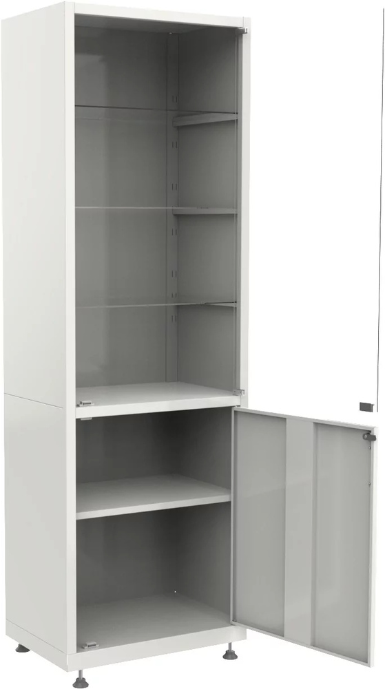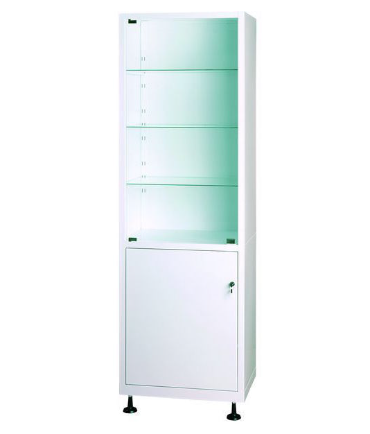 Шкаф разделен на две секции, которые располагаются вертикально одна над другой. Верхний отсек имеет три стеклянных полки и такую же створку с магнитным фиксатором. Нижний отсек представляет собой разделенное одной полкой пространство, которое скрыто от посторонних глаз стальной дверцей, закрывающейся на замок.