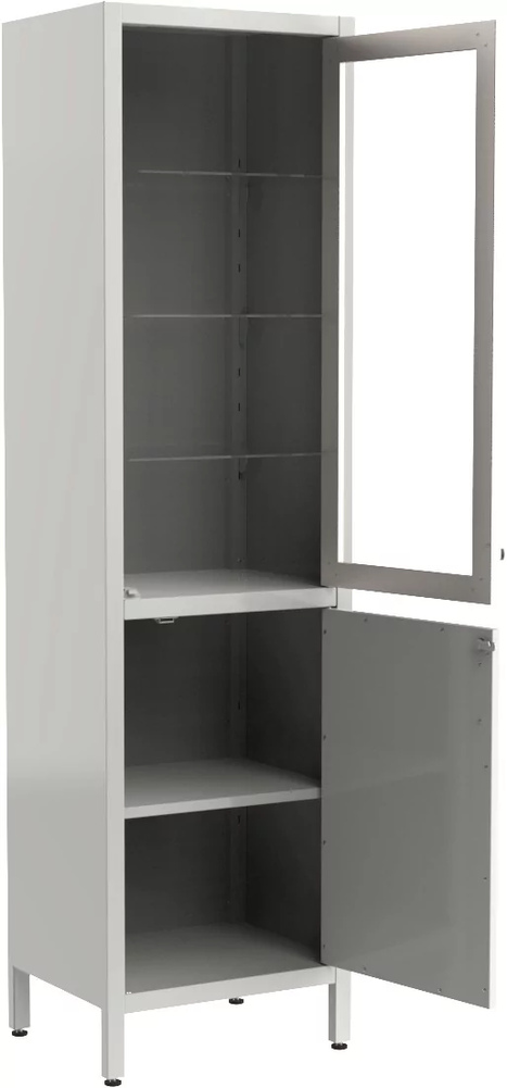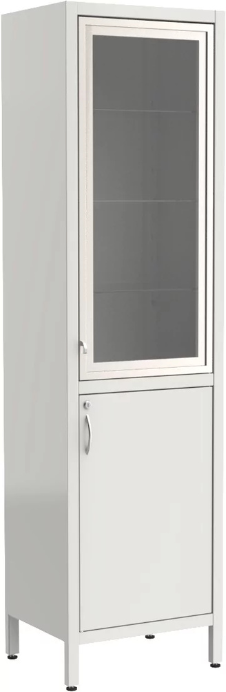 Шкаф разделен на 2 секции. Верхняя часть состоит из 3 стеклянных полок, закрывается на дверцу из стекла, что позволяет хранить препараты, которые не требуют защиты от света или расходный материал. Нижняя часть состоит из 1 стальной полки, дверца запирается на ключ. Используется для хранения дорогостоящих препаратов.
