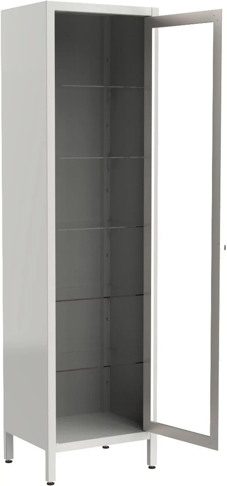Данная мебель для больниц имеет одну вертикальную секцию, которая закрывается высокой стеклянной дверцей. Створка обрамлена рамкой из алюминиевого сплава. Внутри секции есть 5 стеклянных полок, высоту расположения которых можно регулировать на свое усмотрение.