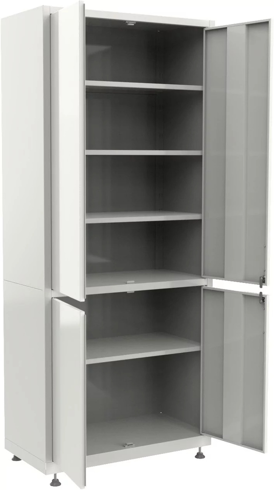 Изделие состоит из 2 независимых друг от друга отсеков, каждый из которых запирается двумя стальными створками на замок. В верхней секции есть 3 полки, а в нижней – 1.