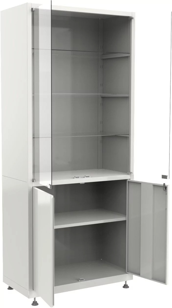 Каркас шкафа типа ШМ оборудован ножками, которые можно «подкручивать», сглаживая неровности пола и придавая устойчивость мебели. Ножки также позволяют делать качественную влажную уборку в помещении. Конструкция изготовлена из стали при помощи сварного шва. Покрытие – устойчивая к частым дезинфекциям краска на полимерно-порошковой основе.