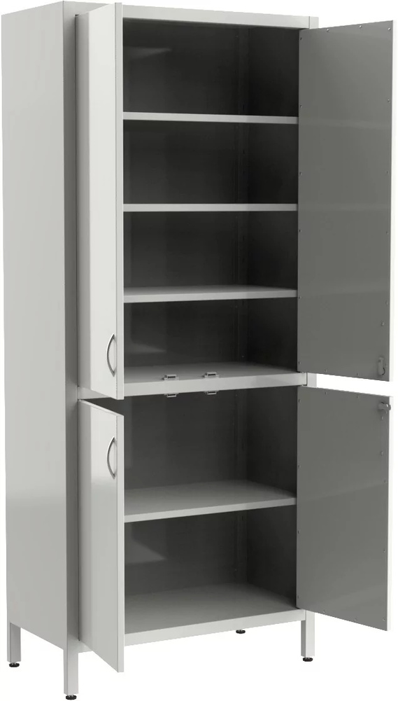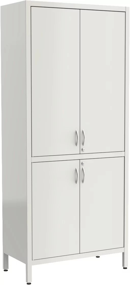 Верхняя часть шкафа закрывается двухстворчатой дверцей, внутри помещаются 3 регулируемые стальные полки. Нижняя часть меньше по размеру, также закрывается двухстворчатой дверцей, но с 1 полкой. Обе части запираются на ключ. Установлен на регулируемых ножках.