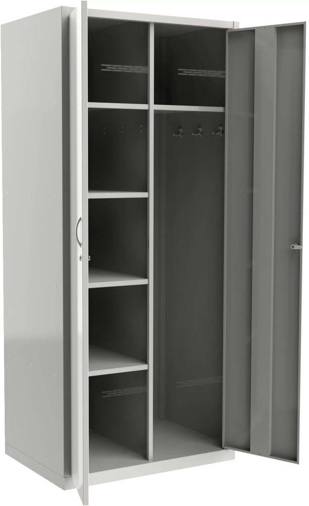 Модель состоит из 2 створок, делящих шкаф вертикально на 2 части. В правой секции находится 1 полка и крючки для развешивания материала. В левой части расположены 4 полки, являющиеся стационарными без возможности регулировки.
